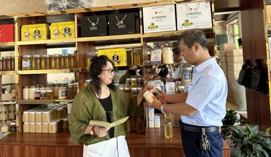 (李金萍向建設(shè)銀行饒河支行工作人員介紹蜂產(chǎn)品銷(xiāo)售情況)