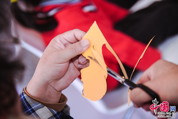 被譽(yù)為“中華神剪”的汪元老師,“以快致勝、以精為美”,40秒的時(shí)間,一副栩栩如生的人物肖像剪影便在其神乎其神的手法下展現(xiàn)了出來?!敖裉焓窃谂笥训摹怖履矫鴣淼模衿媪恕?,一位前來體驗(yàn)的觀眾對手中的肖像剪影贊不絕口。