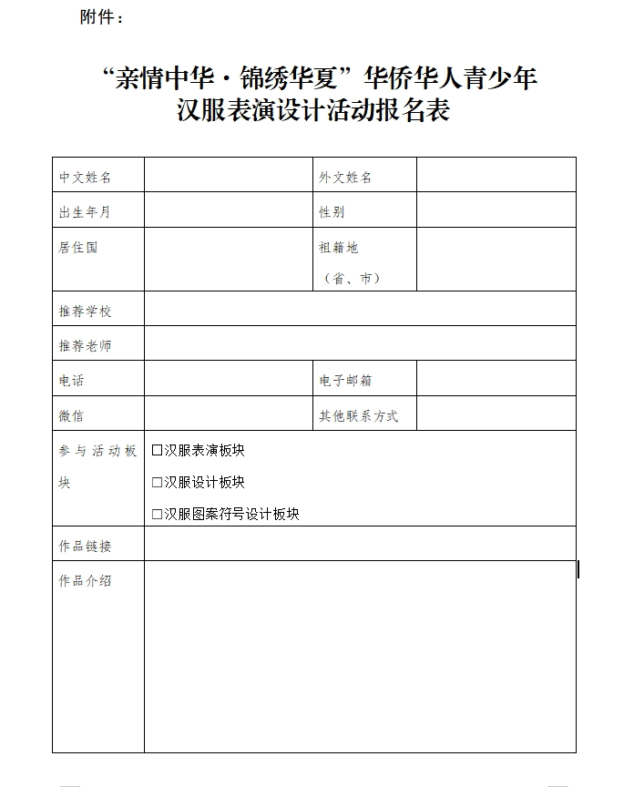“親情中華·錦繡華夏”華僑華人青少年漢服表演設(shè)計(jì)活動(dòng)分為3個(gè)板塊,具體作品要求如下: