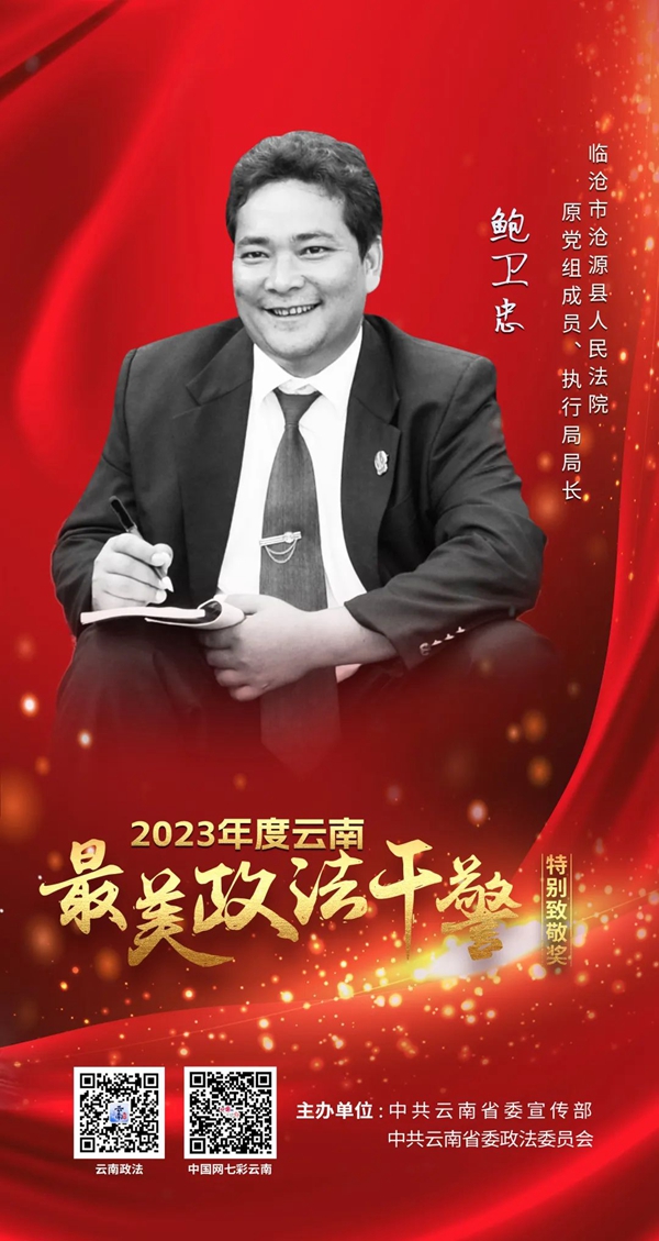 鮑衛(wèi)忠,男,佤族,1976年6月出生,中共黨員,生前系臨滄市滄源縣人民法院黨組成員、執(zhí)行局局長、一級法官。扎根邊疆基層工作24年,他踏遍佤山大地,走遍村村寨寨,從利用以化執(zhí)行為“法制課”的方法,促進發(fā)展理念深入人心、實現(xiàn)邊疆穩(wěn)定,到牽頭梳理歷史存案從而成功化解積壓案件650件,順利打贏“基本解決執(zhí)行難”攻堅戰(zhàn),他用真誠贏得了群眾的認可。在一起標的額10萬余元的合同糾紛案中,面對無力還款的林下養(yǎng)殖戶,鮑衛(wèi)忠不光自己掏錢買雞,還在微信朋友圈里“吆喝叫賣”,幫當事人打開銷路、渡過難關(guān)。2021年10月21日,他在工作崗位上突發(fā)疾病,經(jīng)搶救無效于10月23日不幸去世,年僅45歲。鮑衛(wèi)忠先后被追授“時代楷?!薄叭珖7斗ü佟薄霸颇鲜?yōu)秀共產(chǎn)黨員”“云嶺楷?!钡葮s譽稱號。
