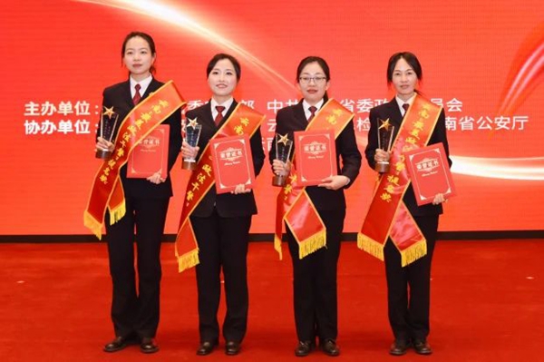 儀式上,授予10名同志2023年度云南“最美政法干警”稱號(hào),追授4名因公犧牲干警2023年度云南“最美政法干警”特別致敬獎(jiǎng),授予10名同志2023年度云南“最美政法干警”提名獎(jiǎng)。其中,昆明市城郊地區(qū)檢察院第一檢察部主任馬銳萍、紅河州檢察院第一檢察部副主任白洲紅獲2023年度“最美政法干警”稱號(hào);曲靖市麒麟?yún)^(qū)檢察院第一檢察部副主任徐莎、德宏州檢察院第九檢察部主任劉波獲2023年度“最美政法干警”提名獎(jiǎng)。