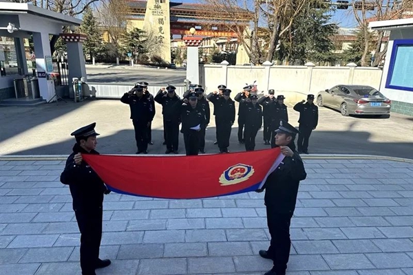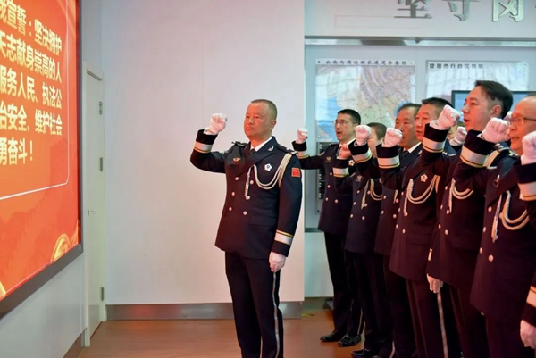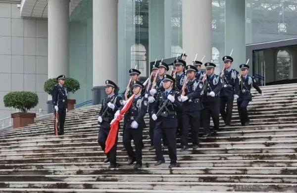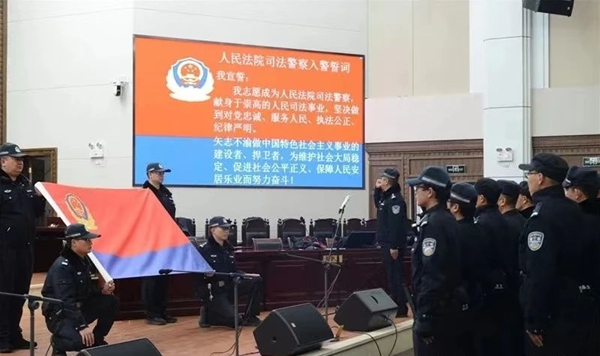 伴隨著雄壯的國歌聲,鮮艷的國旗在全體司法警察的注視下緩緩升起,迎風飄揚。全體司法警察莊嚴地向國旗敬禮,警徽在朝陽下熠熠生輝。面對鮮艷的人民警察警旗,全體司法警察緊握右拳,精神抖擻,重溫入警誓詞,并奏唱《人民法院司法警察之歌》。
