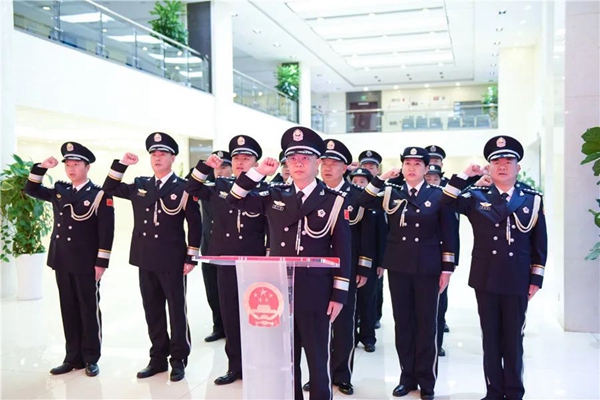 “出警旗!”隨著指揮員的一聲令下,護旗手昂首挺胸,高擎警旗,邁著堅定有力的步伐護送警旗到升旗臺。在嘹亮的《人民法院司法警察之歌》中,鮮艷的警旗隨著初陽冉冉升起、迎風飄揚。全體司法警察高舉右拳,重溫入警誓詞。