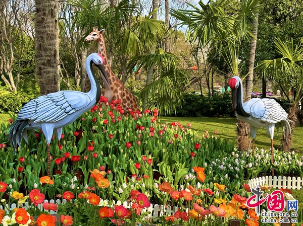 為營造“朝花盛開,夜燈璀璨”的節(jié)日氛圍,結(jié)合今年春節(jié)公園舉辦的“翠湖燈會(huì)”,布置了9組以燈、郁金香為主體的園林小品,分別位于南門、西南島、竹林島、西門、中心區(qū)、金魚島區(qū)域。古典園林藝術(shù)與燈光造型相融合,麒麟獻(xiàn)瑞燈光搭配五彩繽紛的郁金香,火烈鳥、丹頂鶴、斑馬等動(dòng)物燈光造型點(diǎn)綴虞美人,通過錯(cuò)落有致的造型和絢麗的色彩,打造出龍年祥瑞的賀歲場景。