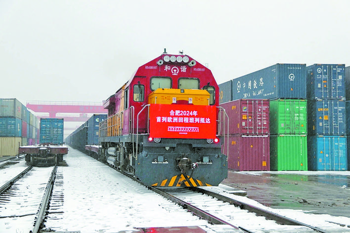 2月4日下午,迎著皚皚白雪,隨著一聲汽笛鳴響,一列中歐班列(合肥)回程班列緩緩駛?cè)牒戏时闭?,這是合肥2024年首列歐洲回程班列。2024年第一個(gè)月,合肥對(duì)外開(kāi)放平臺(tái)持續(xù)發(fā)力,無(wú)論是中歐班列(合肥)還是合肥機(jī)場(chǎng)客貨運(yùn)輸,都迎來(lái)了“開(kāi)門(mén)紅”。