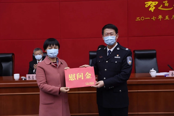 岳修虎頒發(fā)慰問金,張應(yīng)杰、王光輝參加慰問。(云南省委政法委)