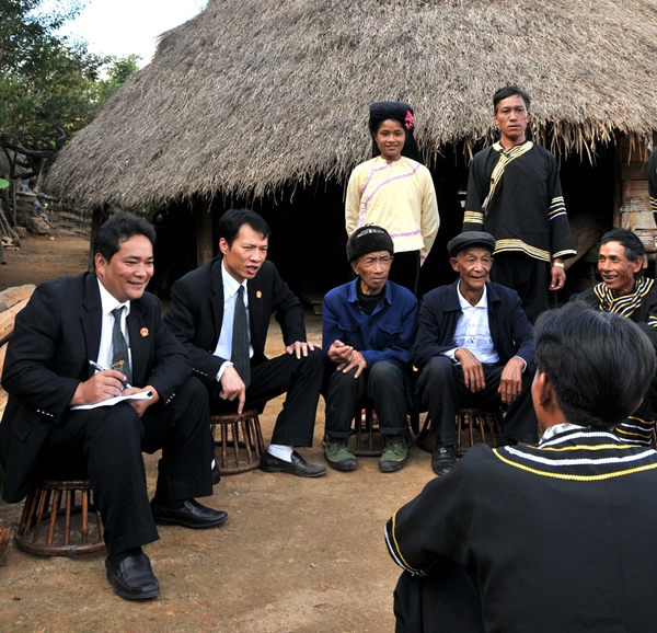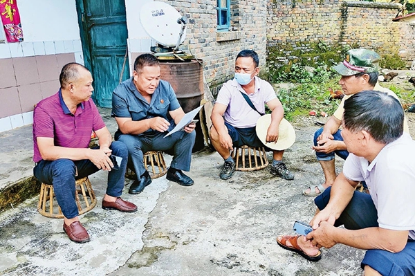 (鮑衛(wèi)忠(左一)在云南省滄源縣勐角鄉(xiāng)控角村委會(huì)小壩卡自然村巡回辦案。云南省高級(jí)人民法院供圖)
