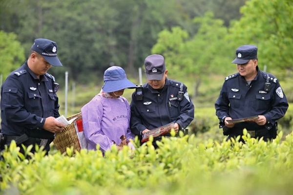 大平坦村是全縣茶葉的主產(chǎn)區(qū),全村地域廣、海拔高、自然小組多且分散,村里人95%都是茶農(nóng),茶園面積2萬畝,日常往來客商多。為了做好村里的治安防控工作,龍門派出所結(jié)合“百萬警進千萬家”“陽光活動”等工作,組建社區(qū)警務隊定期開展茶山巡邏防控工作。