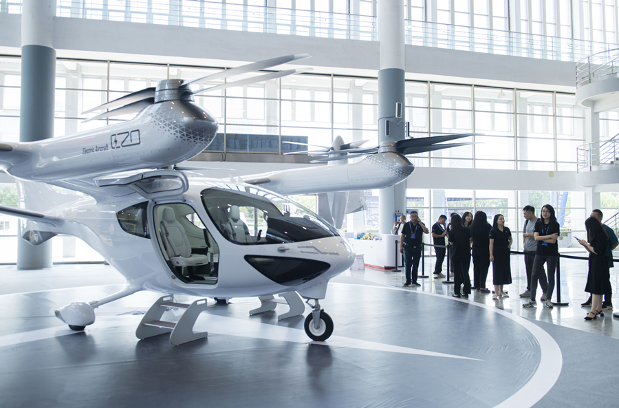 觀眾在2024低空經(jīng)濟(jì)發(fā)展大會創(chuàng)新成果展區(qū)了解一款電動垂直起降飛行器。新華社記者 傅天 攝
