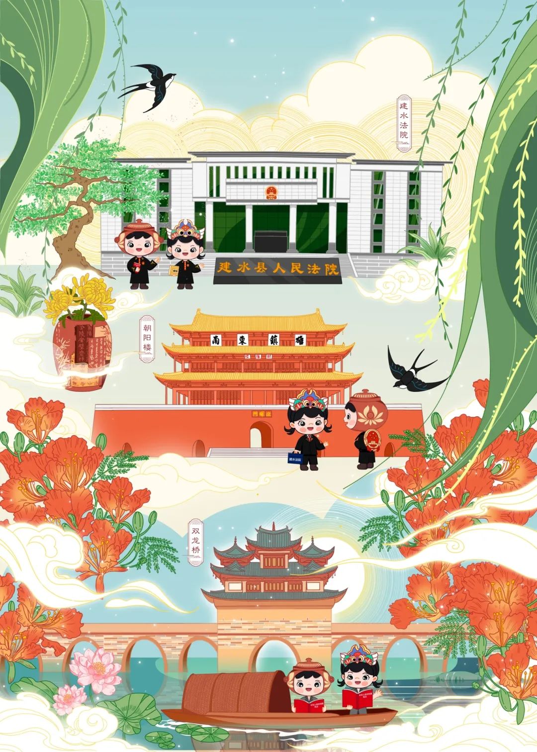 (2024年8月,建水縣法院打造原創(chuàng)動漫IP燕燕陶陶,將法院文化與古城歷史文化巧妙結(jié)合,以建水古城特色景點朝陽樓、雙龍橋為背景,并融合建水縣縣樹“香樟樹”、縣花“鳳凰花”以及建水紫陶等元素制作宣傳海報。建水縣法院供圖)