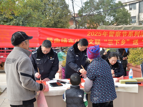 送福到萬家,守護平安年。為熱烈慶祝第5個中國人民警察節(jié),進一步做好暖警愛警工作,1月7日,曲靖市公安局文聯(lián)組織開展送“?!毕禄鶎訉懘郝?lián)活動,為基層民警和當?shù)厝罕娝蜕闲麓汉凸?jié)日的祝福。