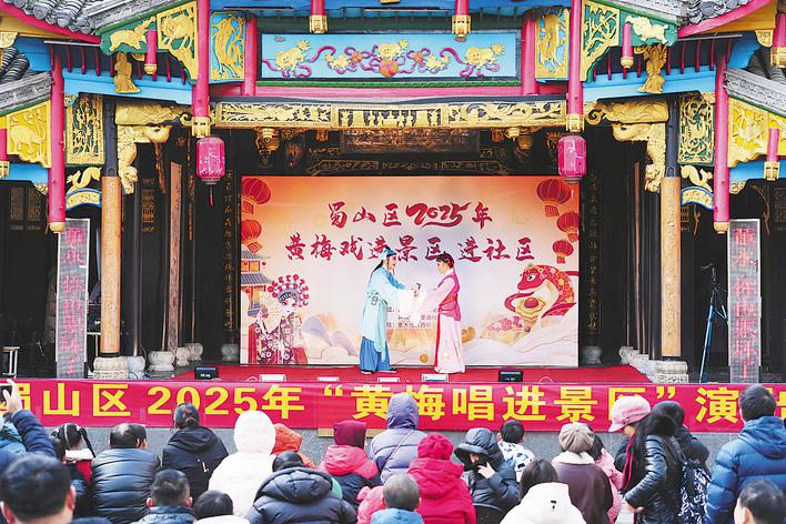 1月11日,在金大地街區(qū)古戲臺(tái)上演的“蜀山區(qū)2025年黃梅戲進(jìn)景區(qū)專場(chǎng)演出”,吸引了眾多市民觀看。由蜀山區(qū)文化和旅游局主辦的“蜀山區(qū)2025年黃梅戲進(jìn)景區(qū)專場(chǎng)演出”于1月11日至12日在金大地街區(qū)古戲臺(tái)和摩爾廣場(chǎng)開(kāi)演,為期2天。