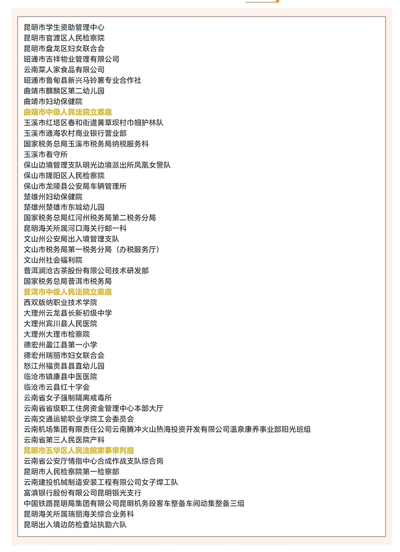 其中,云南法院系統(tǒng)共有1名法官被授予云南省三八紅旗手稱號,3個集體被授予云南省三八紅旗集體稱號,其分別是普洱市瀾滄縣人民法院黨組成員、副院長、一級法官陶智芳及曲靖市中級人民法院立案庭、普洱市中級人民法院立案庭、昆明市五華區(qū)人民法院家事審判庭。(云南省高級人民法院供稿)