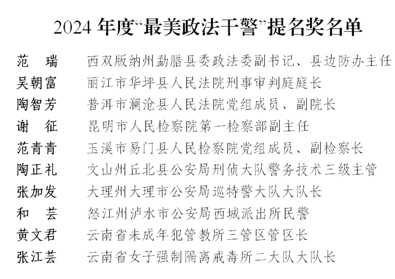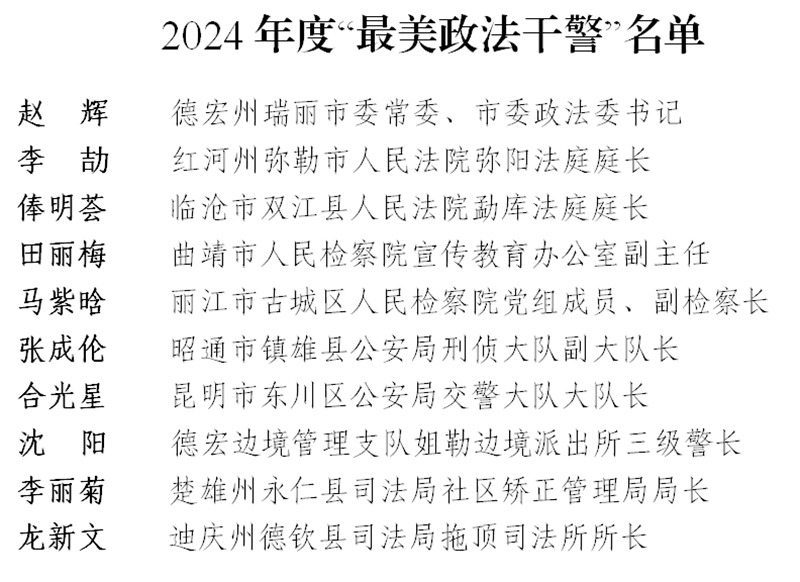 活動現(xiàn)場發(fā)布了云南省2024年度“最美政法干警”名單。自2024年活動啟動以來,經(jīng)過嚴(yán)格的組織程序和層層推薦選拔,從各州市黨委政法委和省級政法各單位報送的76名推薦對象中遴選出41名候選人,并經(jīng)過嚴(yán)格評審、媒體公示等程序,最終評選確定趙輝等10人獲評2024年度云南“最美政法干警”、范瑞等10人獲評“最美政法干警”提名獎。期間,還利用網(wǎng)絡(luò)新媒體對候選人先進(jìn)事跡進(jìn)行集中展播宣傳。