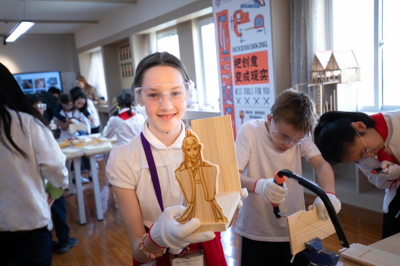 在學校木工坊,格里夫菲爾德小學的學生們體驗國家級非遺項目——傳統(tǒng)木工技藝。圍繞近期風靡社交網(wǎng)絡(luò)的“哪吒書笠”手工制作,中英學生在木工老師指導(dǎo)下協(xié)作完成鋸切、雕刻與組裝。在活動過程中,英方師生不僅感受到了中國傳統(tǒng)木工工藝的巧妙絕倫,還深刻體會到了蘊含在其中“專注執(zhí)著、精益求精”的“匠人精神”?;顒硬粌H讓非遺文化“活”起來,更通過創(chuàng)意載體促進了兩國青少年的協(xié)作交流。隨后的互動課程中,英國教師帶來了富有特色的教學展示,雙方師生在輕松愉快的氛圍中交流學習心得。