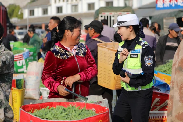 (紅塔警方走進小石橋彝鄉(xiāng)農(nóng)特產(chǎn)品春豌豆交易市場,開展“流動式”交通安全普法宣傳)