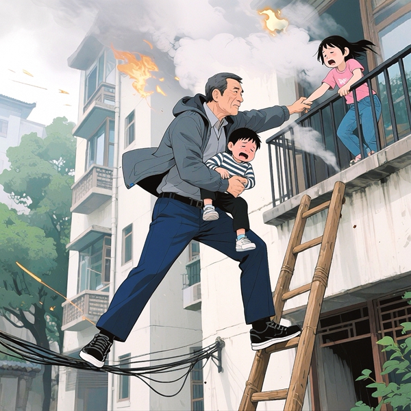 起火的二樓窗戶玻璃炸裂,火舌竄向三樓陽臺(tái),透過濃煙,兩個(gè)蜷縮的身影若隱若現(xiàn),劇烈的咳嗽聲和呼救聲揪緊了余志勇的心。60歲的他心里只有一個(gè)聲音:“必須馬上救人!”