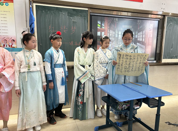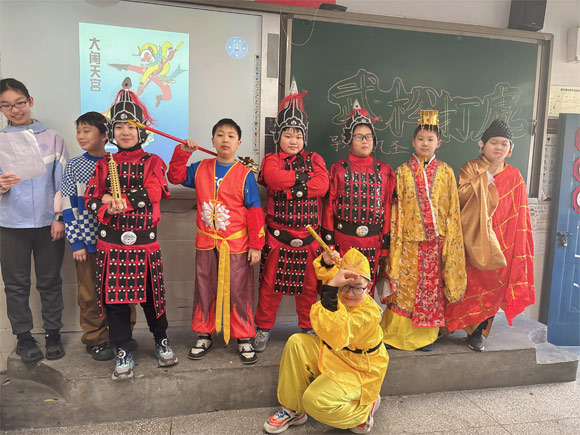 五六年級的“課本劇大舞臺”將活動推向高潮。學(xué)生們自主改編《草船借箭》《晏子使楚》等經(jīng)典課文,從劇本創(chuàng)作、道具制作到角色演繹全程參與。各班微型舞臺各美其美,活動期間,掌聲陣陣。老師說道:“課本劇讓孩子真正讀懂了課本中的人物?!?/p>