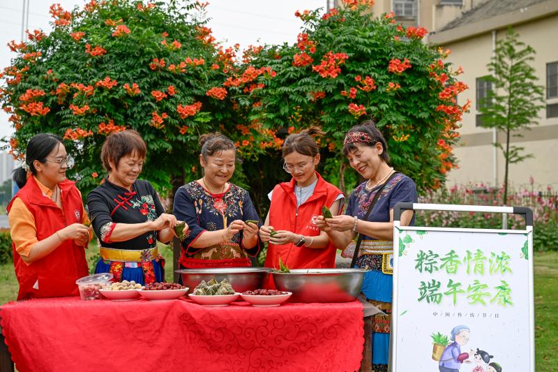 2025年5月22日,在廬陽(yáng)區(qū)林店街道榮城北苑生活小區(qū),社區(qū)志愿者正在居民一起包粽子。當(dāng)日,林店街道連水社區(qū)開(kāi)展“粽葉飄香,濃情端午”主題活動(dòng),志愿者與社區(qū)居民歡聚一堂,包粽子、吃粽子,其樂(lè)融融,喜迎端午佳節(jié)到來(lái)。(廬陽(yáng)區(qū)人民政府)