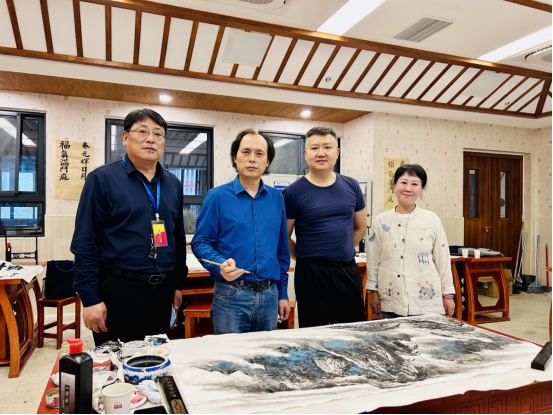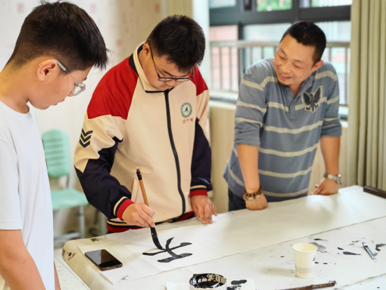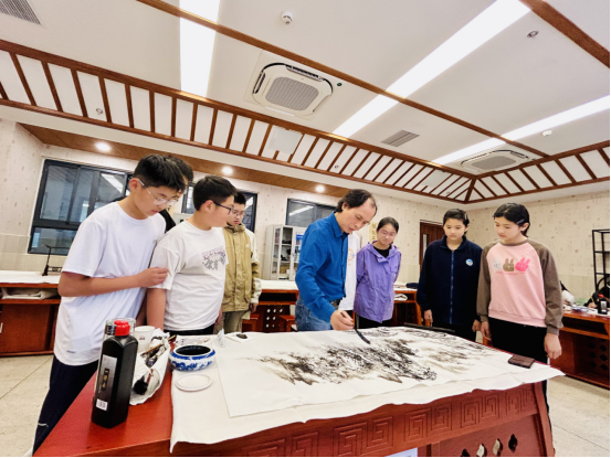 隨后,畫家張絮祥、張仁斌、鄭圣武、李敏,書法家岳曲、張勇、王鵬等八位藝術家步入書法教室,他們在書畫領域造詣頗深,各個身懷絕技?;顒蝇F場,藝術家們全情投入創(chuàng)作,筆鋒游走間,一幅幅精美的書法和繪畫作品逐漸成型?;蛏n勁有力的書法,或意境悠遠的國畫,每一筆每一劃都蘊含著深厚的藝術功底和獨特的創(chuàng)作風格,讓在場的師生們目不暇接,沉浸在藝術的奇妙世界中。這些作品不僅展現了藝術家們的高超技藝,更體現了美育浸潤行動中藝術對校園文化的滋養(yǎng),也與“Yue動廬陽歡樂校園”的活力氛圍相契合。