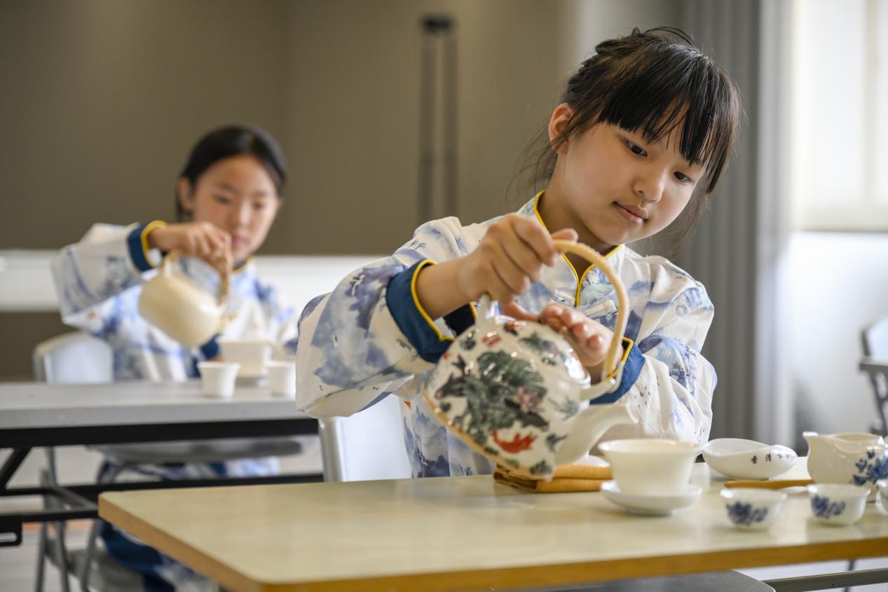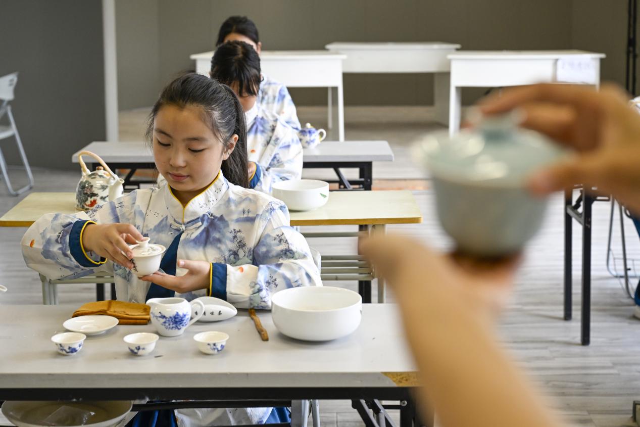 在茶藝體驗(yàn)區(qū)里,大學(xué)生們展示了優(yōu)雅的茶藝表演,從溫杯、泡茶、奉茶到品茶,每一個步驟都講解得細(xì)致入微。小學(xué)生們不僅了解了中國源遠(yuǎn)流長的茶文化,還親自體驗(yàn)了泡茶的樂趣,感受傳統(tǒng)文化的獨(dú)特魅力。