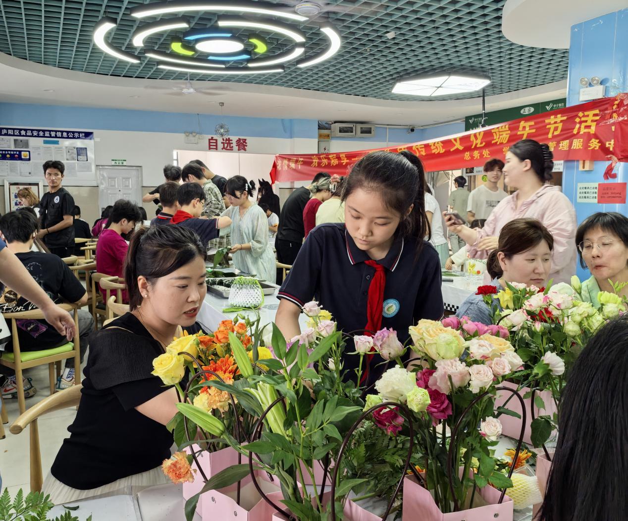 除了包粽子和茶藝,本次活動還新增學(xué)習(xí)插花技藝的特色實(shí)踐項(xiàng)目。在插花體驗(yàn)區(qū),中澳科技職業(yè)學(xué)院的花藝?yán)蠋熛蛐W(xué)生們詳細(xì)介紹了插花的基本技巧,包括花材的選擇、色彩的搭配、造型的設(shè)計等知識。老師一邊講解,一邊親自示范,將不同種類的鮮花、綠葉錯落有致地搭配在一起,創(chuàng)作出一幅幅精美的插花作品。在插花過程中,孩子們不僅學(xué)習(xí)到了實(shí)用的花藝知識,還在與自然花卉的親密接觸中,提升了審美能力,感受到了勞動創(chuàng)造美的獨(dú)特魅力。