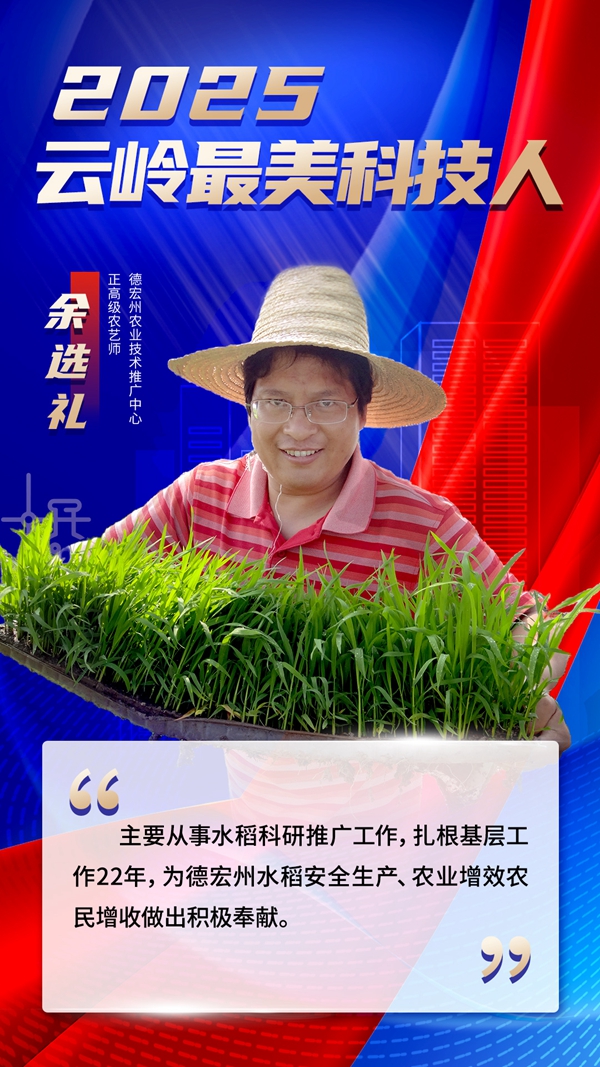 余選禮長期從事水稻科研推廣工作,帶領(lǐng)團隊選育10個通過云南省審定的優(yōu)質(zhì)軟米水稻品種,引進篩選出5個適宜當?shù)刂魍频膬?yōu)質(zhì)雜交稻,主持制定了《德宏州水稻生產(chǎn)技術(shù)綜合規(guī)范》地方標準,累計在德宏州推廣示范425萬畝,實現(xiàn)新增優(yōu)質(zhì)稻谷19.65萬噸,新增產(chǎn)值4.85億元。為德宏州水稻安全生產(chǎn)、農(nóng)業(yè)增效、農(nóng)民增收作出積極貢獻。