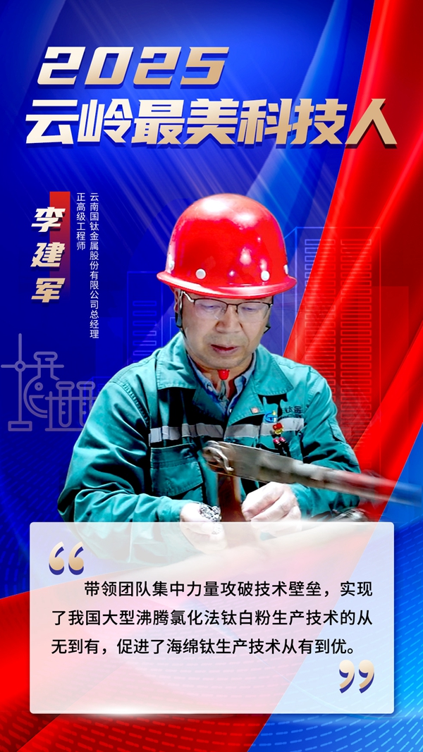 李建軍長期從事冶金及化工生產(chǎn),是我國鈦產(chǎn)業(yè)發(fā)展的領軍人物,實現(xiàn)了我國大型沸騰氯化法鈦白粉生產(chǎn)技術(shù)的從無到有,促進了海綿鈦生產(chǎn)技術(shù)的從有到優(yōu)。主持的1萬噸級海綿鈦項目實現(xiàn)航空航天級產(chǎn)品穩(wěn)定量產(chǎn),填補國內(nèi)高端海綿鈦生產(chǎn)空白,保障了軍工材料安全。