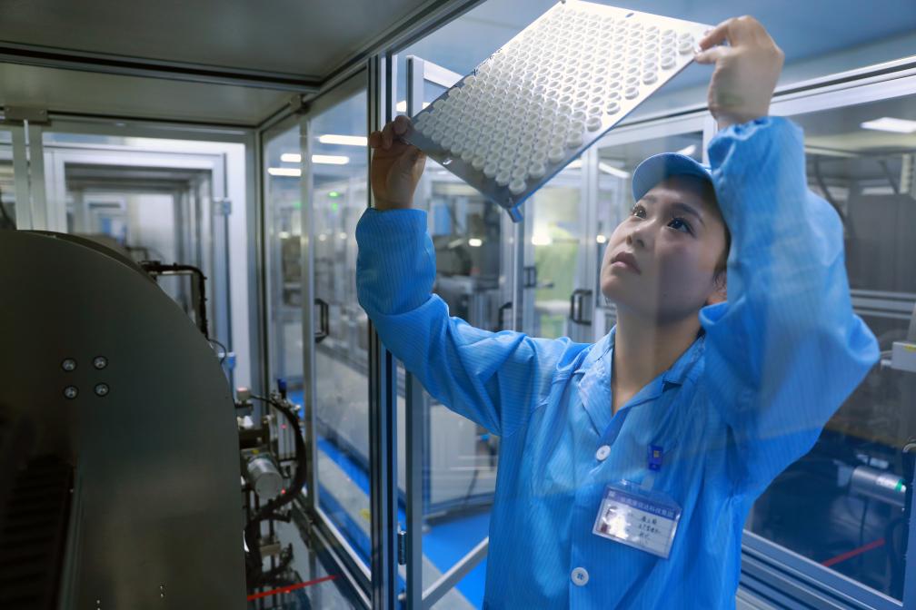 彩色隱形眼鏡智能化生產(chǎn)線上,一名工人在查看產(chǎn)品。新華社記者 郭剛 攝