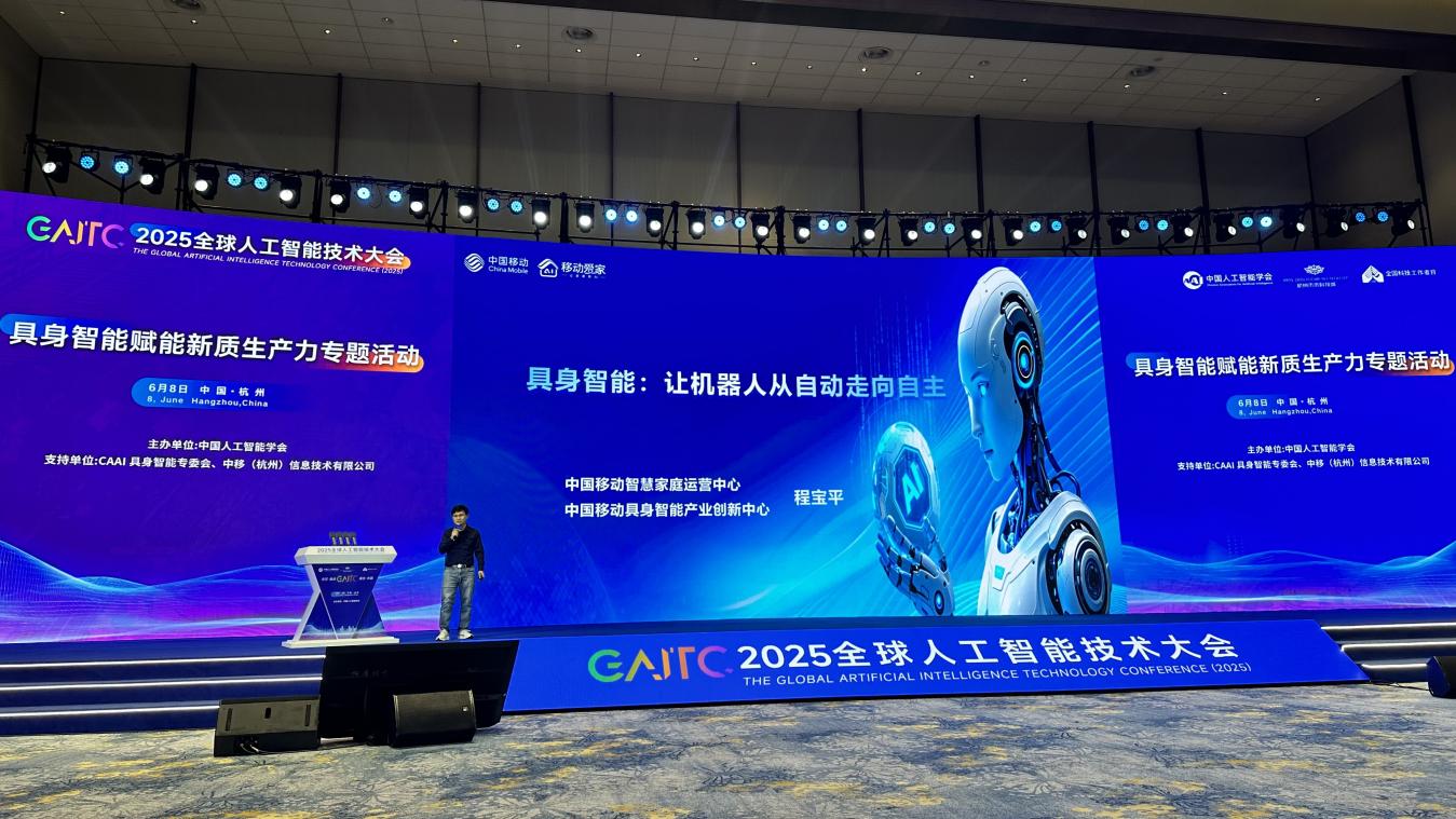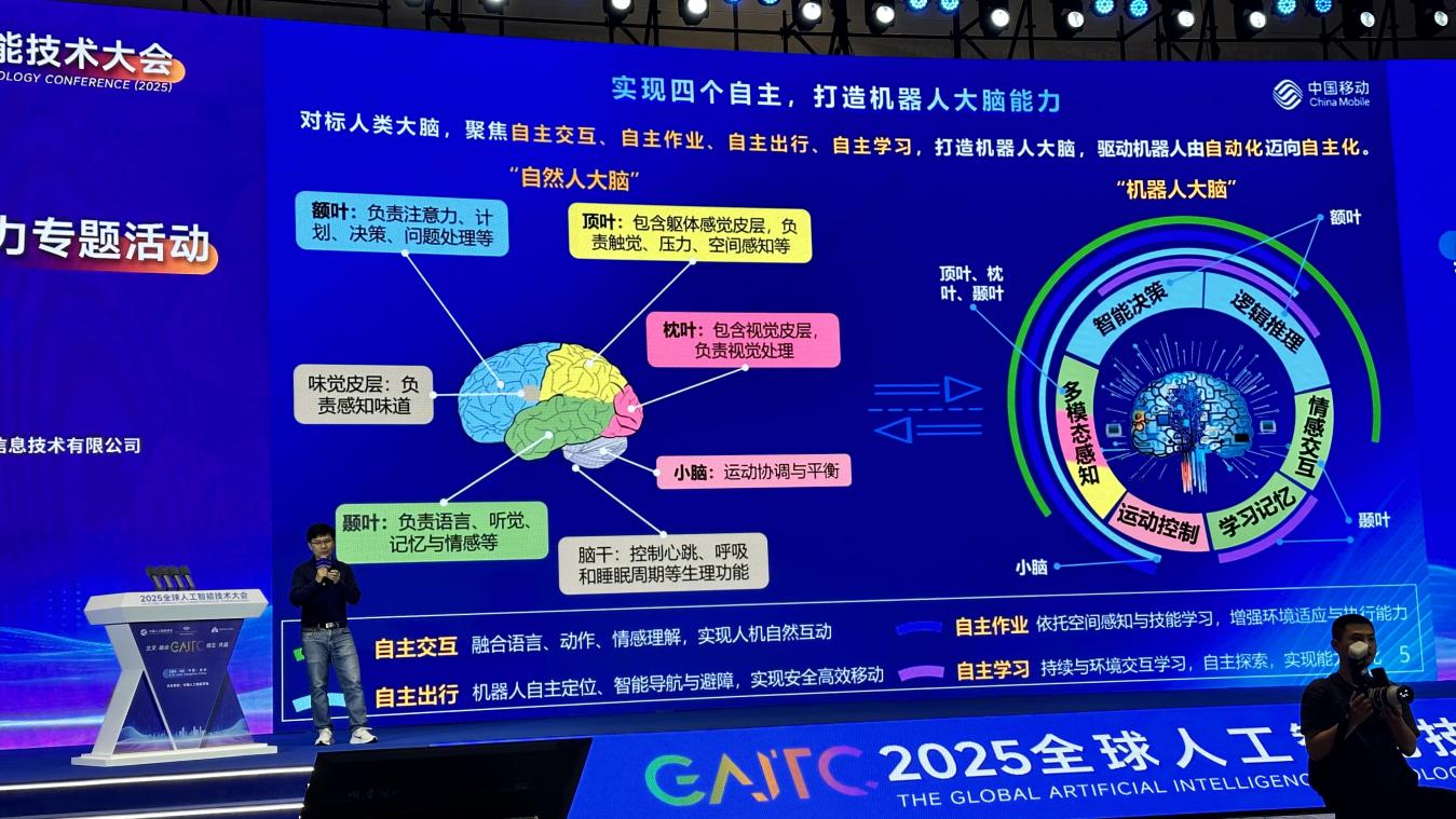 大會期間,與會嘉賓圍繞人工智能前沿技術(shù)突破、產(chǎn)業(yè)應(yīng)用場景、倫理治理挑戰(zhàn)等核心議題,通過專題研討、前沿成果發(fā)布、重磅戰(zhàn)略合作簽約等多種形式,展開交流。其中,被譽為“引領(lǐng)下一代產(chǎn)業(yè)革命關(guān)鍵方向”的具身智能(Embodied AI)成為全場焦點,中國移動具身智能產(chǎn)業(yè)創(chuàng)新中心總經(jīng)理程寶平發(fā)表了《具身智能:讓機器人從自動走向自主》報告。?