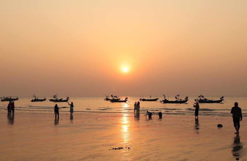晨曦微露,海面波光粼粼。銀白色的沙灘上,早起散步的人們留下一串串腳印。