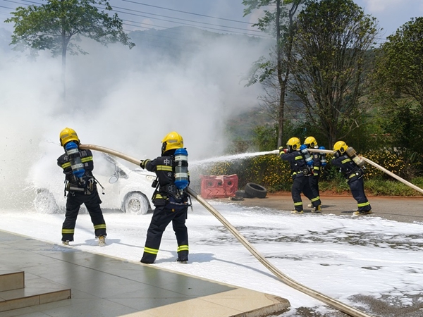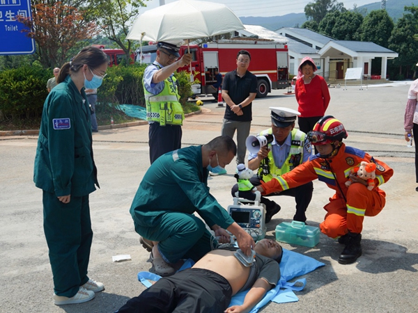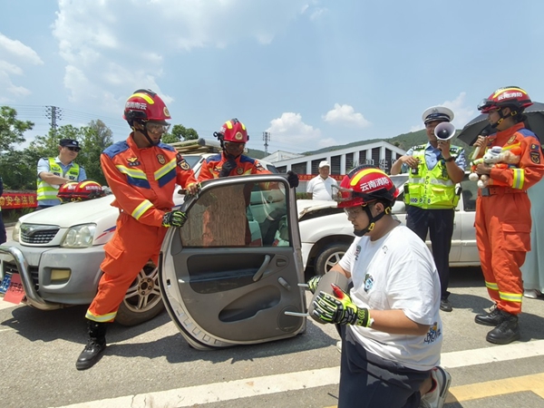 緊接著消防員還為大家現(xiàn)場進行了安全帶“冷”知識應(yīng)用演示、隧道被困人員疏散演示、車輛自燃滅火演示、模擬傷員急救演示和車輛盲區(qū)演示,大家看得津津有味,云南交投集團昆明西管理處工作人員張先生說:“我在旁邊拍照都感受到火焰溫度很高,消防員們真的太辛苦了,我今后會注意不在車內(nèi)放易燃物品。”
