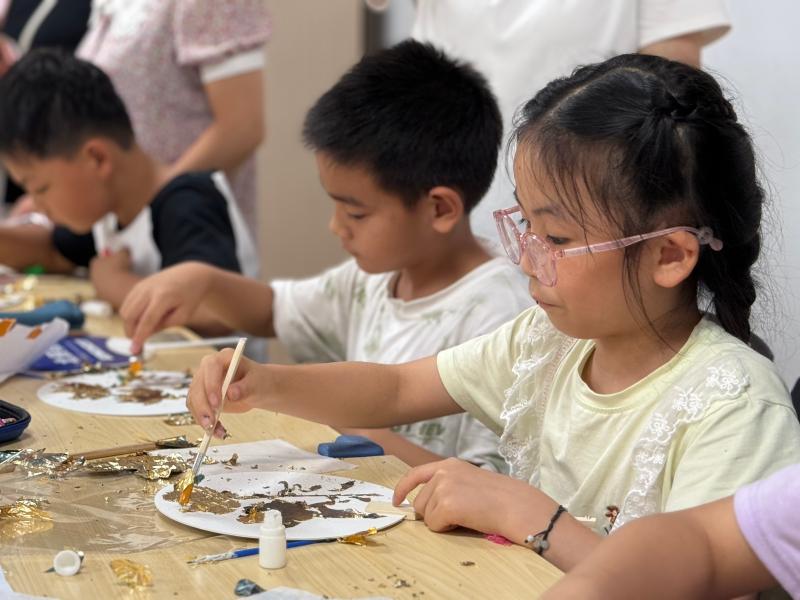 隨后進(jìn)入制作環(huán)節(jié),孩子們紛紛化身小小藝術(shù)家,迫不及待地打開材料包,與家長們攜手合作。繪圖時,孩子們充分發(fā)揮自己的想象力,在扇面上勾勒出各種充滿童趣的圖案;上膠過程中,他們小心翼翼地涂抹,力求膠水均勻分布;燙金、貼箔步驟里,孩子們和家長緊密配合,輕輕將金箔貼合在扇面上,再用工具仔細(xì)掃箔,確保金箔完美地附著。制作過程中,大家遇到問題相互交流、共同探討,現(xiàn)場氛圍熱烈而溫馨。