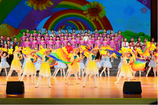 展演在激昂的開場歌舞《唱支山歌給黨聽》《快樂向未來》中拉開序幕。第一篇章“童聲頌黨恩”中,孩子們以《民族的豐碑》《沒有共產(chǎn)黨就沒有新中國》等經(jīng)典曲目唱響對黨的深情禮贊;廬州文化主題的《黃龍民謠》《包公謠》《我真的到了合肥了》則用鄉(xiāng)音鄉(xiāng)韻展現(xiàn)合肥人文底蘊;民族歌舞《燈火里的中國》《溯·躍》以翩躚舞姿描繪民族團(tuán)結(jié)的壯美畫卷。第二篇章“童行承黨心”聚焦傳統(tǒng)文化傳承。吹打樂《乾坤戰(zhàn)鼓》氣勢磅礴,非遺舞蹈《戲龍珠》《榴花紅燈娃俏》生動演繹民俗魅力;徽韻歌曲聯(lián)唱《山野的風(fēng)》《六尺巷》《安徽是個好地方》將徽風(fēng)皖韻融入時代旋律。第三篇章“童志耀黨輝”以童趣盎然的《嬉魚燈》《親親黃梅戲》、活力四射的《奔跑在陽光下》等節(jié)目,展現(xiàn)新時代青少年全面發(fā)展、向陽生長的蓬勃朝氣。尾聲《祖國有我》和藝術(shù)節(jié)節(jié)主題歌的集體演繹,將全場氛圍推向高潮。