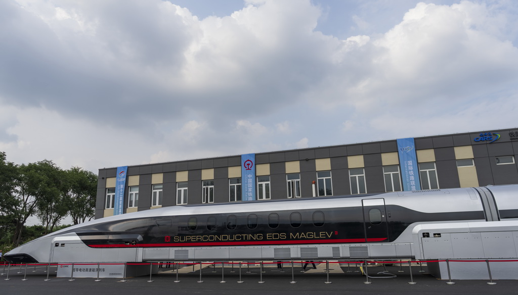 這是7月9日在國(guó)家鐵道試驗(yàn)中心展區(qū)拍攝的時(shí)速600公里高速磁浮交通系統(tǒng)。新華社記者 才揚(yáng) 攝