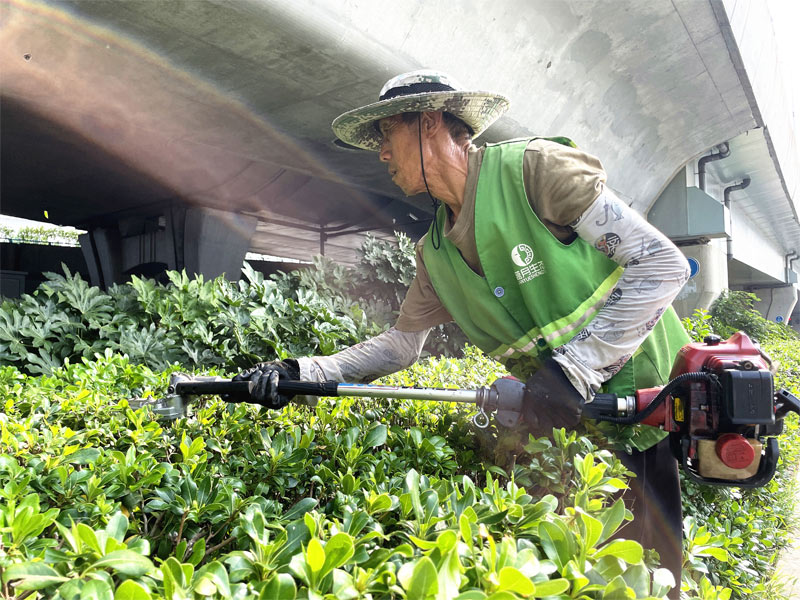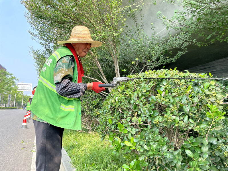 養(yǎng)護工人溫師傅手持綠籬機,正修剪著綠化帶內(nèi)的海桐球,轟鳴的機器聲中,熱浪夾雜著飛舞的草屑迎面撲來,雖只是上午8點多,溫師傅的臉上掛滿汗珠,后背也已經(jīng)被汗水浸濕。