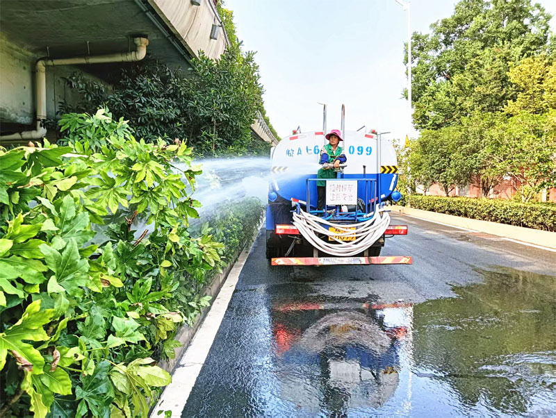 在北一環(huán)上,徐師傅站在緩緩行駛的灑水車上,手握水管,管口噴涌而出的水流跟隨他的操作不斷變換形狀,噴出的水霧在陽光下折射出小小的彩虹,均勻地灑向渴求滋潤的草坪與灌木叢。