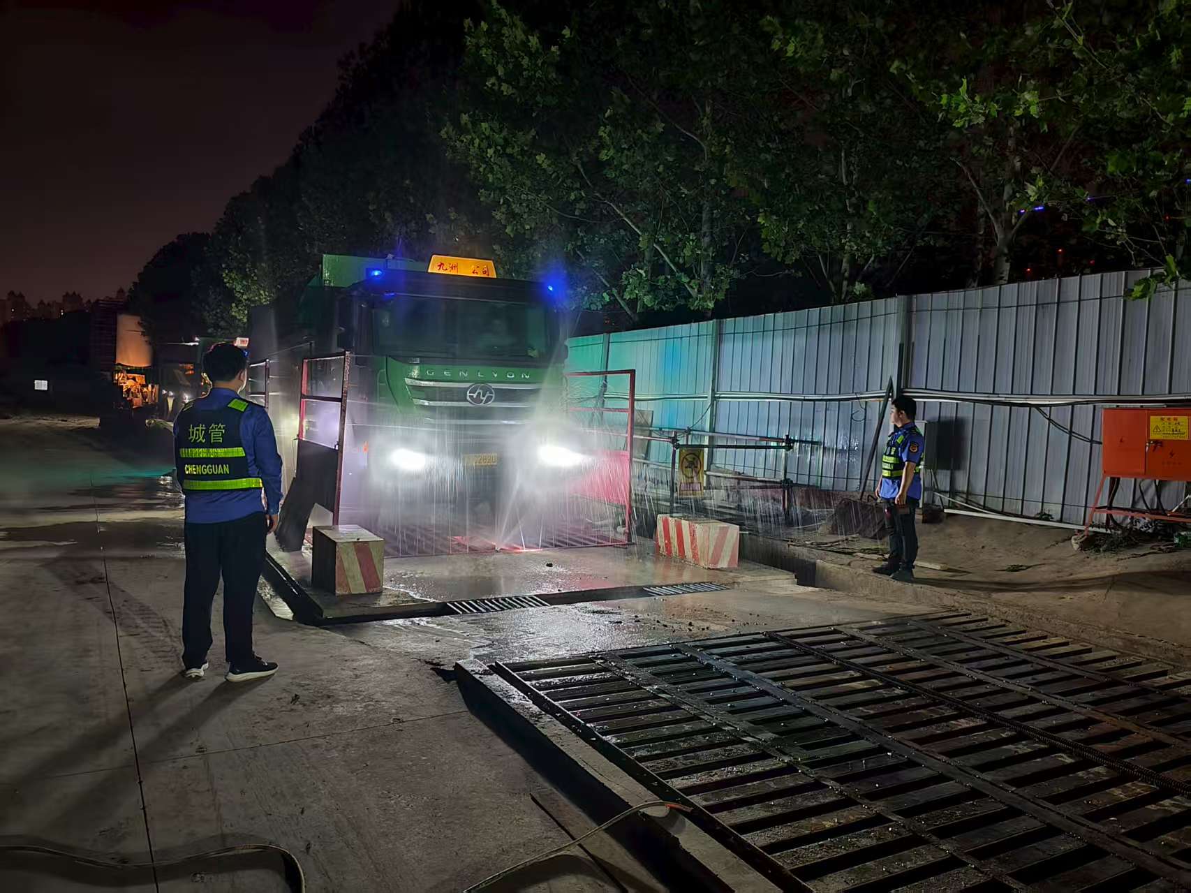 (夜間渣土巡查,執(zhí)法隊員在檢查渣土車車身沖洗情況)