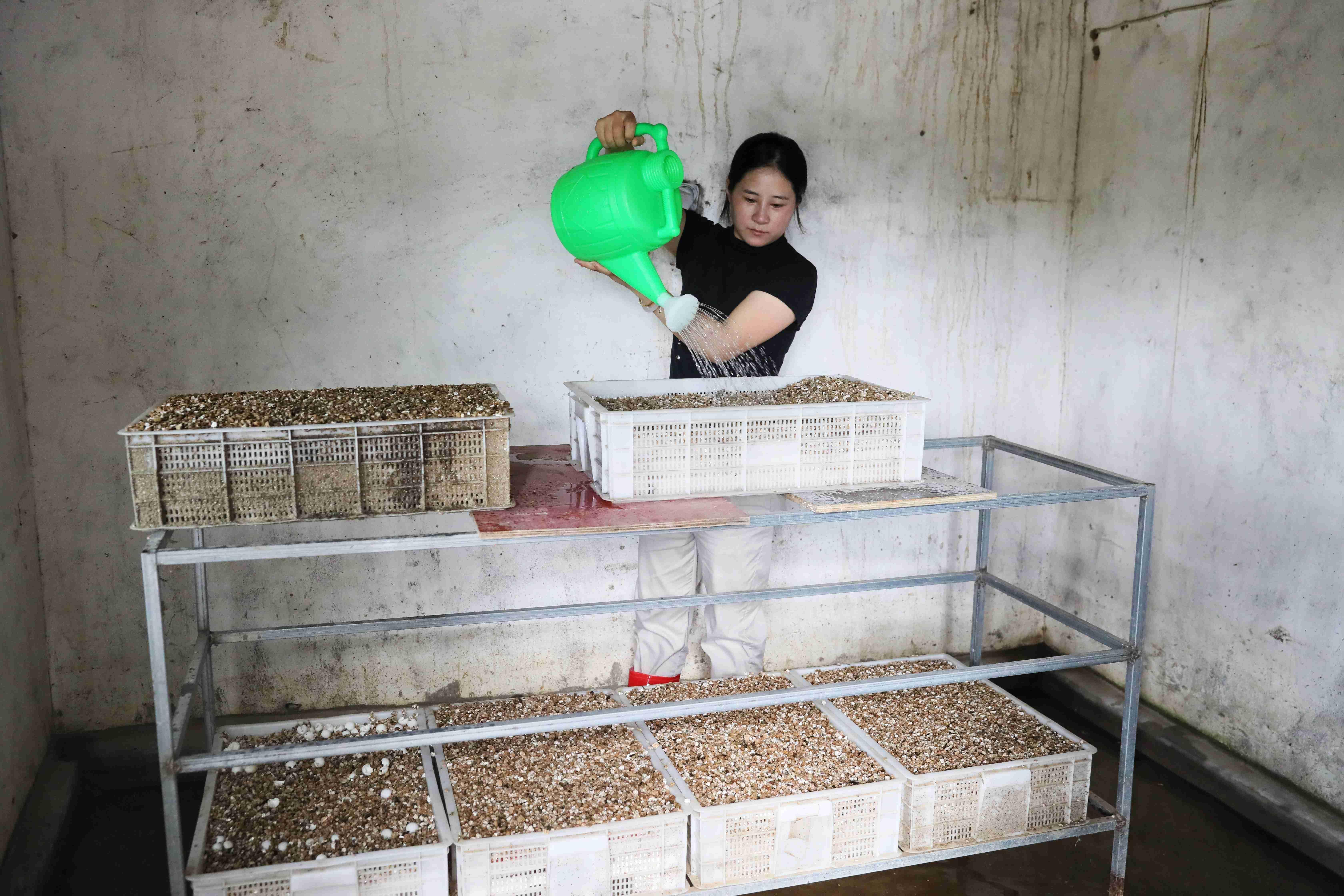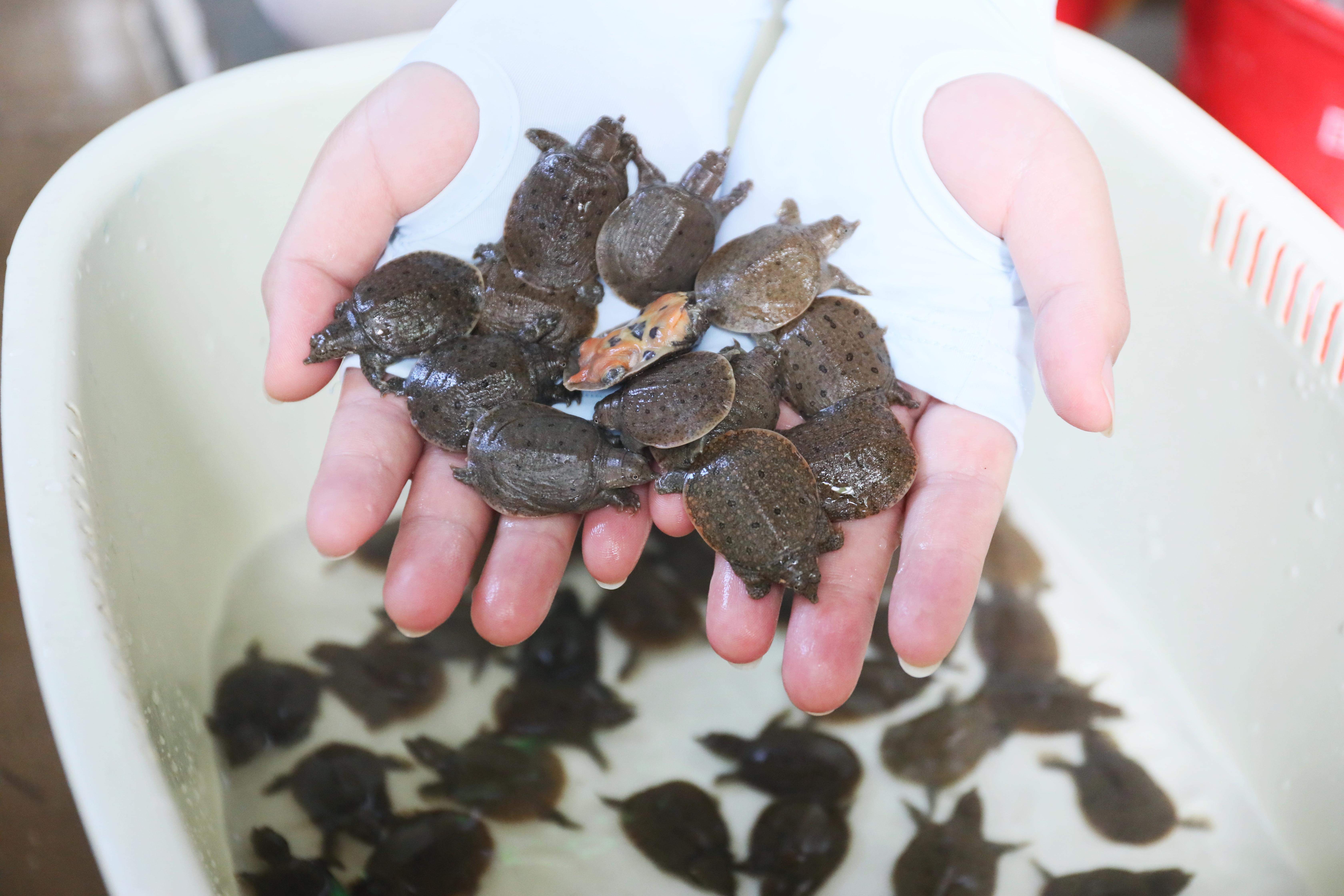(萬書錫在孵化房?jī)?nèi)給老鱉幼苗補(bǔ)水 劉少芬攝)