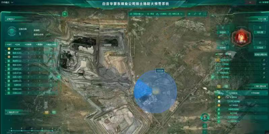 同時,該公司為確保礦區(qū)生態(tài)復墾草原防火的安全,改變靠人員巡檢模式,進一步減輕防火工作人員的工作強度,提高露天礦區(qū)草原管護成效,完成排土場防火預警監(jiān)控系統(tǒng)建設。該項目區(qū)別于傳統(tǒng)森林草原防火選擇制高點進行全覆蓋的方式,因為排土場高差約80米的階梯式結(jié)構,單一的制高點布置存在監(jiān)管盲區(qū)。利用三維視域分析模擬選點及現(xiàn)場測試相結(jié)合的方式,選取12處分布式防火監(jiān)測點位,構建無死角、高頻次、全天候、立體化的排土場草原防火智能監(jiān)測網(wǎng)絡。系統(tǒng)監(jiān)測范圍涵蓋轄區(qū)南排土場、北排土場和作業(yè)現(xiàn)場,主要是由前端熱成像監(jiān)控、太陽能供電、無線傳輸、智能化安全平臺系統(tǒng)融合、三維GIS系統(tǒng)融合、應急預案系統(tǒng)功能建設等方面構成,實現(xiàn)區(qū)域內(nèi)人員、車輛、火情的實時監(jiān)測、自動預警、遠程巡查等功能,建立多位一體的綜合預警管控系統(tǒng),實現(xiàn)多維度監(jiān)測預警,呈現(xiàn)“礦山防火一張圖”,以智能之“眼”,防范未“燃”。