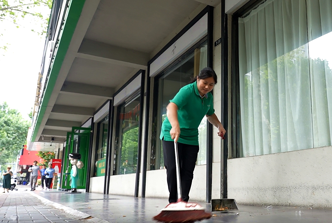 圖|潁上路與鳳淮路交口一餐飲店門口,服務(wù)員正熟練打掃門前衛(wèi)生