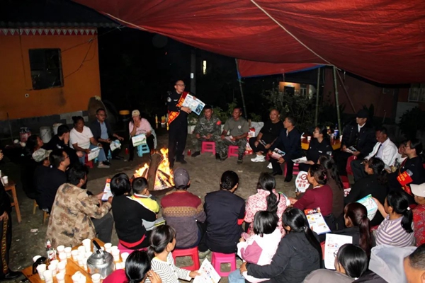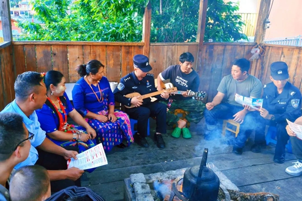 轉(zhuǎn)機出現(xiàn)在民警輔警的一次入戶走訪中。那天夜幕降臨時,傈僳族、景頗族群眾圍坐在篝火旁,用“擺時”抒發(fā)情感、傳遞生活感悟。民間藝人董紹琴憑借動人的歌聲和精彩的即興創(chuàng)作,贏得了陣陣喝彩。這一場景讓民警靈光乍現(xiàn):既然“擺時”深受群眾喜愛,為何不把法律條文也唱進山歌里?