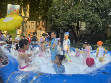 另一邊,孩子們喜愛(ài)的“快樂(lè)小老板”跳蚤市場(chǎng)同樣熱鬧非凡?!靶⌒≌乒瘛眰儼雅f書(shū)、舊玩具擺放得整整齊齊,學(xué)著招呼客人,在交易中懂得了分享的意義。飛花令挑戰(zhàn)區(qū),孩子們吟誦著帶“花”的詩(shī)句,紛紛搶答為了贏取茉莉香囊。清涼泳池的泡泡里、露天影院的光影中,滿是孩子們假期里的純粹快樂(lè)。