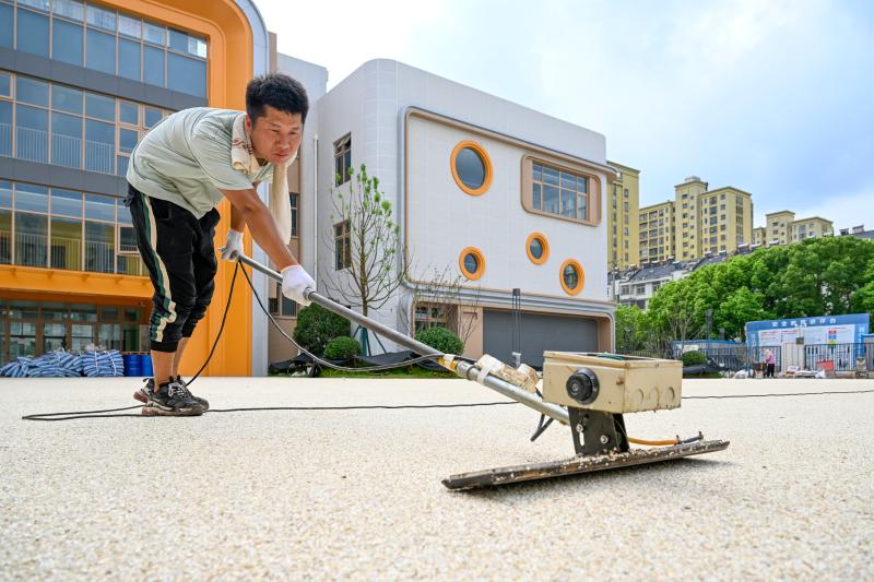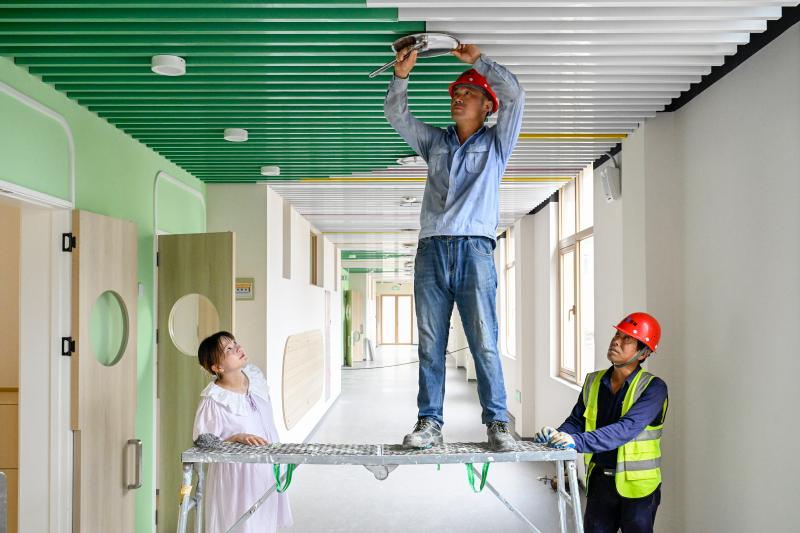 2025年8月8日,在安徽省合肥廬陽經(jīng)濟開發(fā)區(qū)轄區(qū)合肥市宿州路幼兒園教育集團云錦分園,工人正在對校園室內(nèi)外進行美化亮化。據(jù)了解,合肥市宿州路幼兒園教育集團云錦分園總建筑面積6339.65平方米,包含15個教學班級,5個功能教室,可容納450名適齡兒童學前教育需求,今年9月1日正式開園。(廬陽區(qū)人民政府)