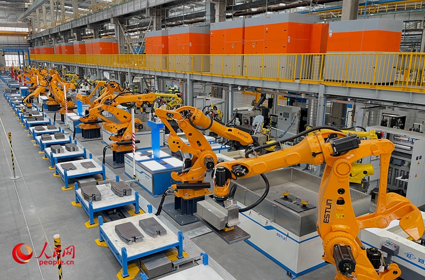 23條自動(dòng)化流水線上,150臺(tái)機(jī)器人動(dòng)作精準(zhǔn),焊花四濺,切割、焊接、涂裝等工序有序推進(jìn),7臺(tái)智能行車和30臺(tái)AGV運(yùn)輸車往來(lái)穿梭,物料精準(zhǔn)投放。