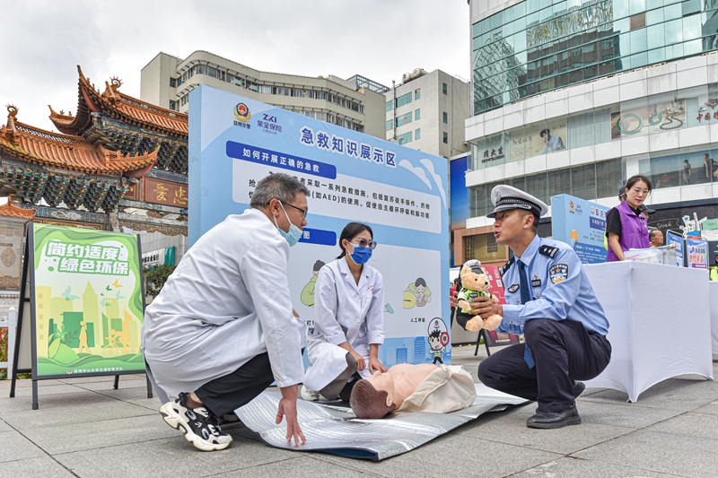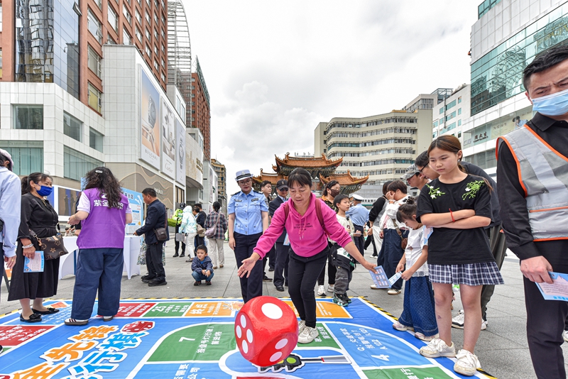 在活動(dòng)現(xiàn)場分設(shè)的10個(gè)普法宣傳互動(dòng)區(qū),宣傳員結(jié)合行業(yè)職能職責(zé),緊扣“安全守護(hù)”核心思路,以突出交通違法行為、易致亂致禍安全隱患及非法金融活動(dòng)為切入點(diǎn),現(xiàn)場“以案釋法”“以案說險(xiǎn)”,解析規(guī)范佩戴安全頭盔的重要性及交通違法帶來的安全隱患、致禍后果和經(jīng)濟(jì)成本,并借以展播宣傳片、交通安全知識(shí)問答、安全警示圖例展示和“交通安全飛行棋”、業(yè)務(wù)咨詢服務(wù)、心肺復(fù)蘇急救技能學(xué)習(xí)體驗(yàn)及發(fā)放宣傳材料等互動(dòng)方式,強(qiáng)化交通安全宣傳警示教育、金融安全知識(shí)、急救知識(shí)傳播的吸引力和滲透力,進(jìn)一步提升廣大交通參與者交通安全意識(shí)和金融風(fēng)險(xiǎn)行為認(rèn)知及避險(xiǎn)救護(hù)能力,共同為生命守護(hù)賦能。