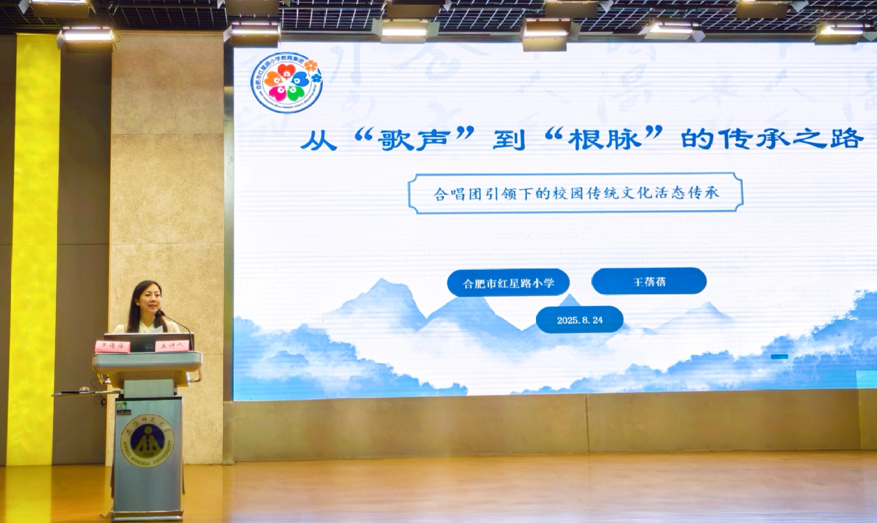 活動期間,合肥市紅星路小學(xué)音樂教師、合肥市王蓓蓓名師工作室主持人王蓓蓓,受邀代表廬陽區(qū)在安徽省中小學(xué)傳統(tǒng)文化傳承成果專項(xiàng)展演分享活動中作經(jīng)驗(yàn)交流。王蓓蓓以《春滿巢湖》的創(chuàng)作與排演為例,深入闡述合唱曲目創(chuàng)新的關(guān)鍵路徑——既要注重傳統(tǒng)旋律的“適唱化”改編,讓經(jīng)典曲調(diào)更貼合中小學(xué)生的演唱特點(diǎn);也要推動合唱與教學(xué)深度融合,通過多元形式實(shí)現(xiàn)文化內(nèi)涵“可視化”。王蓓蓓強(qiáng)調(diào),傳統(tǒng)文化傳承的核心在于引導(dǎo)學(xué)生從“知道”到“理解”再到“內(nèi)化”,需將“教”的專業(yè)引導(dǎo)與“悟”的親身實(shí)踐相結(jié)合,把抽象的文化內(nèi)涵轉(zhuǎn)化為可聽、可感、可參與的體驗(yàn)過程,讓學(xué)生在歌聲中觸摸文化根脈,真正打造“合唱+傳統(tǒng)文化”的特色傳承模式。