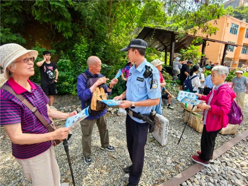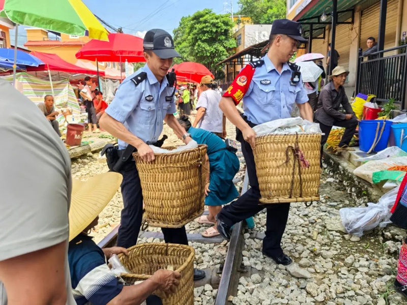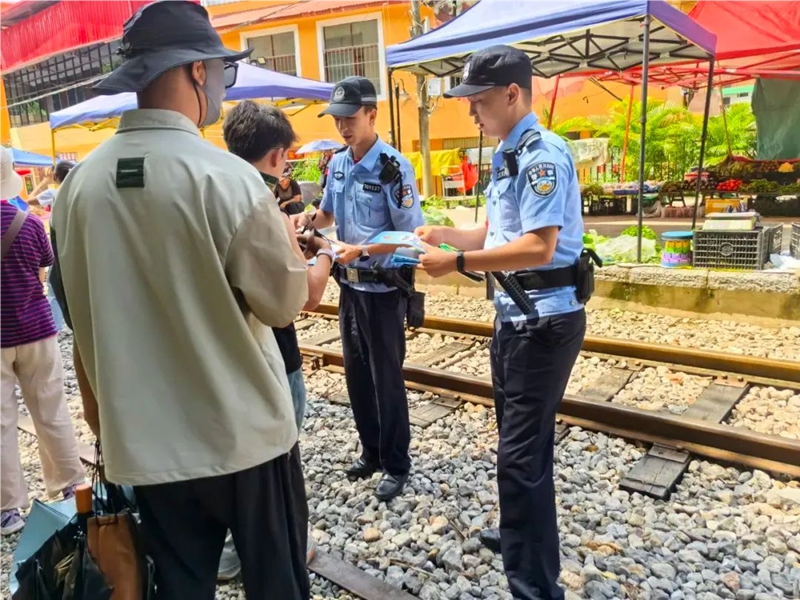 每逢周一,在云南省紅河州屏邊縣白河鎮(zhèn)“百年鐵軌集市”上,聚集了不少趕集群眾和前來打卡的游客,為營造安全、有序、和諧的集市環(huán)境,屏邊縣公安局白河派出所聯(lián)合開遠(yuǎn)鐵路公安處河口站派出所開展路地聯(lián)合宣傳。