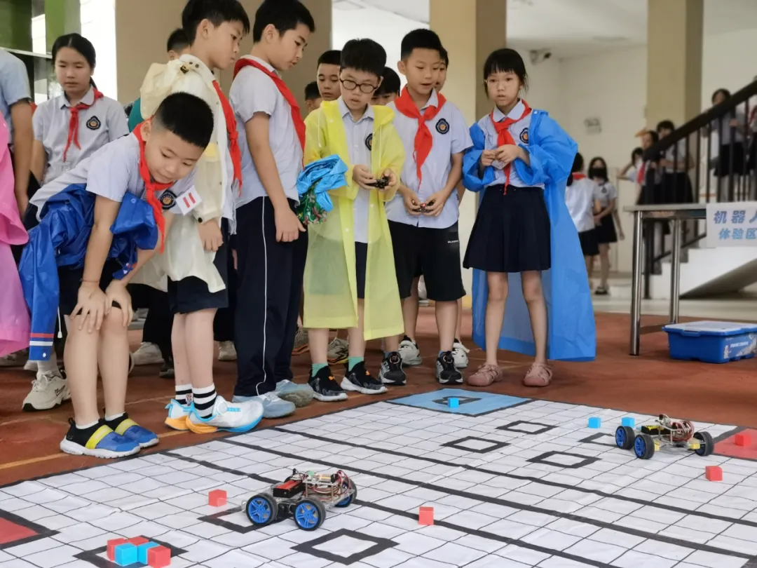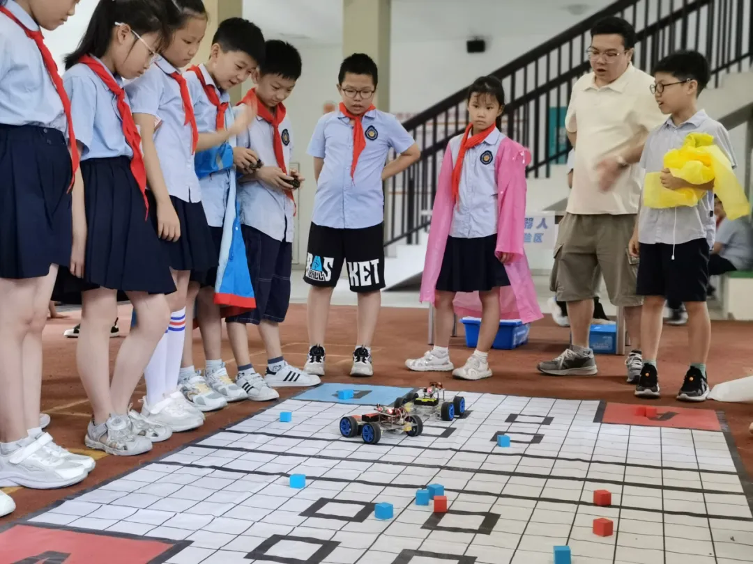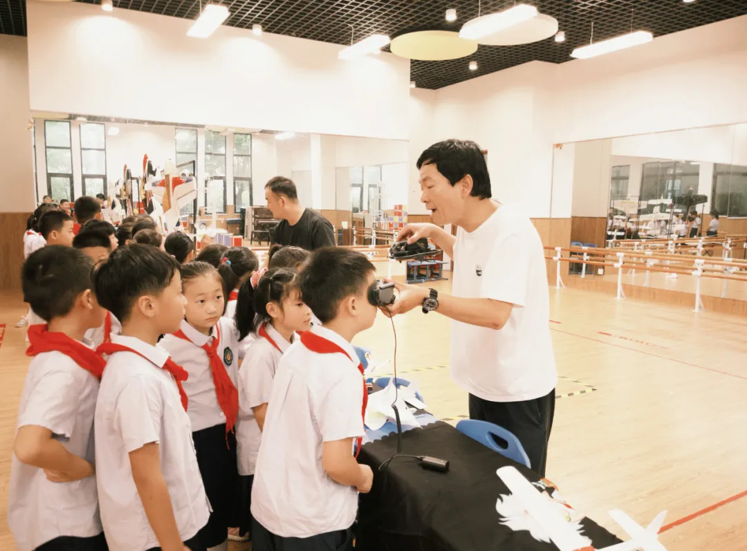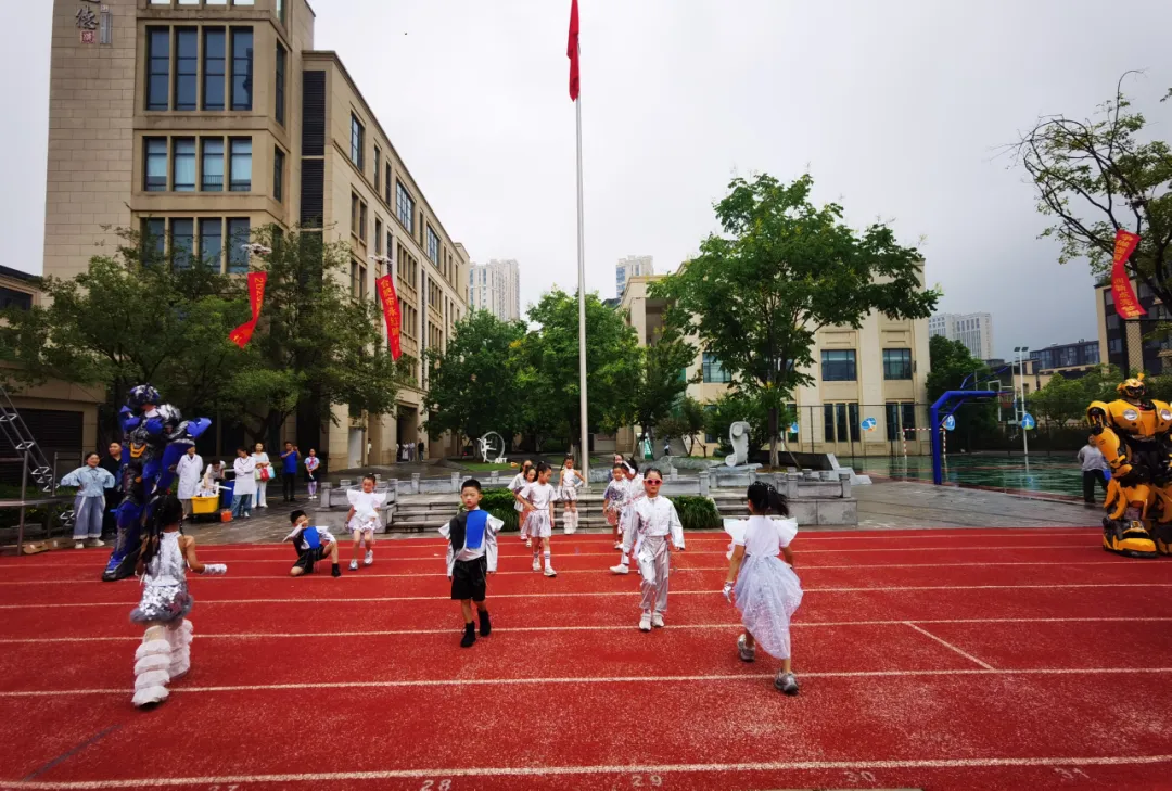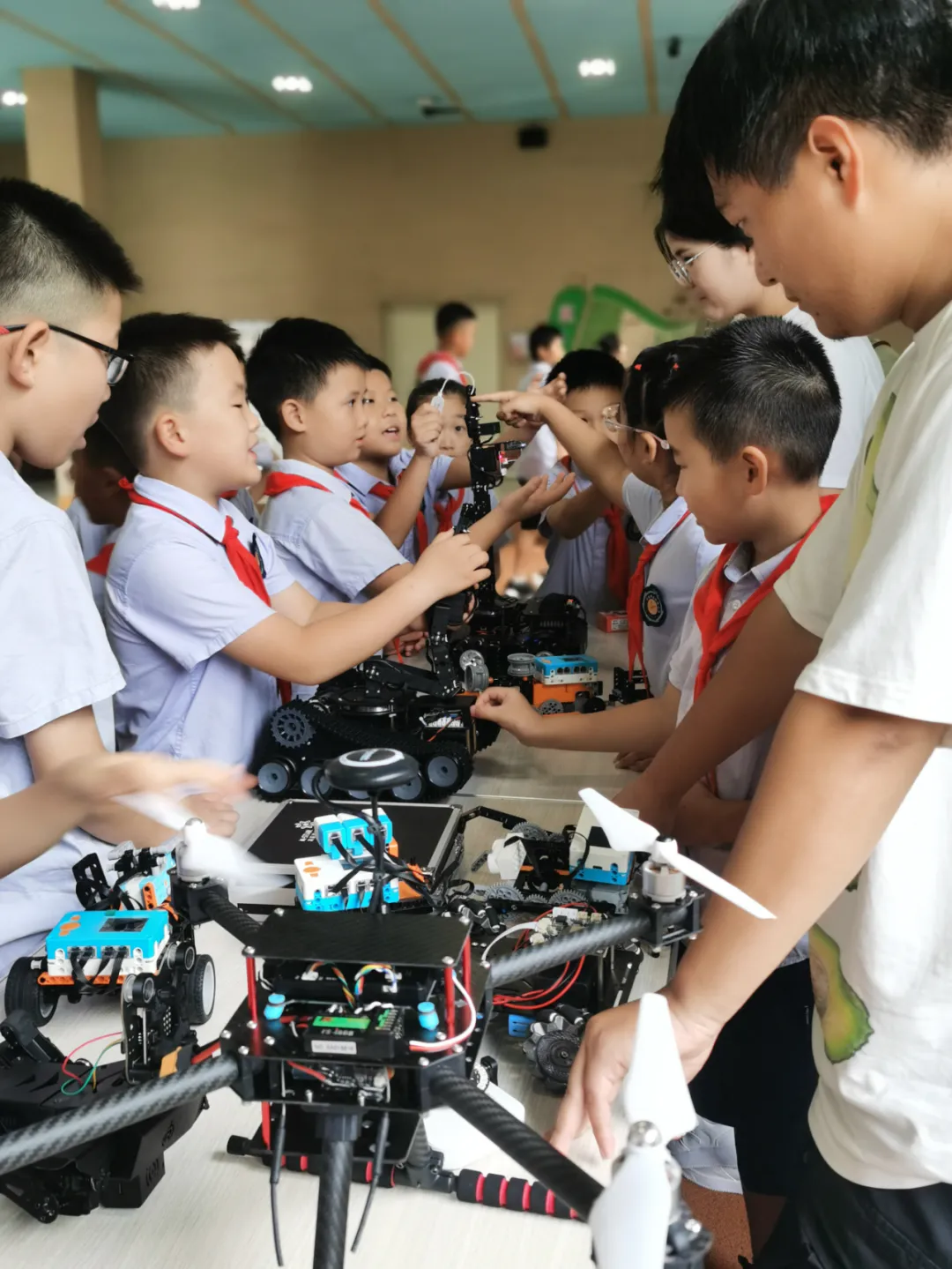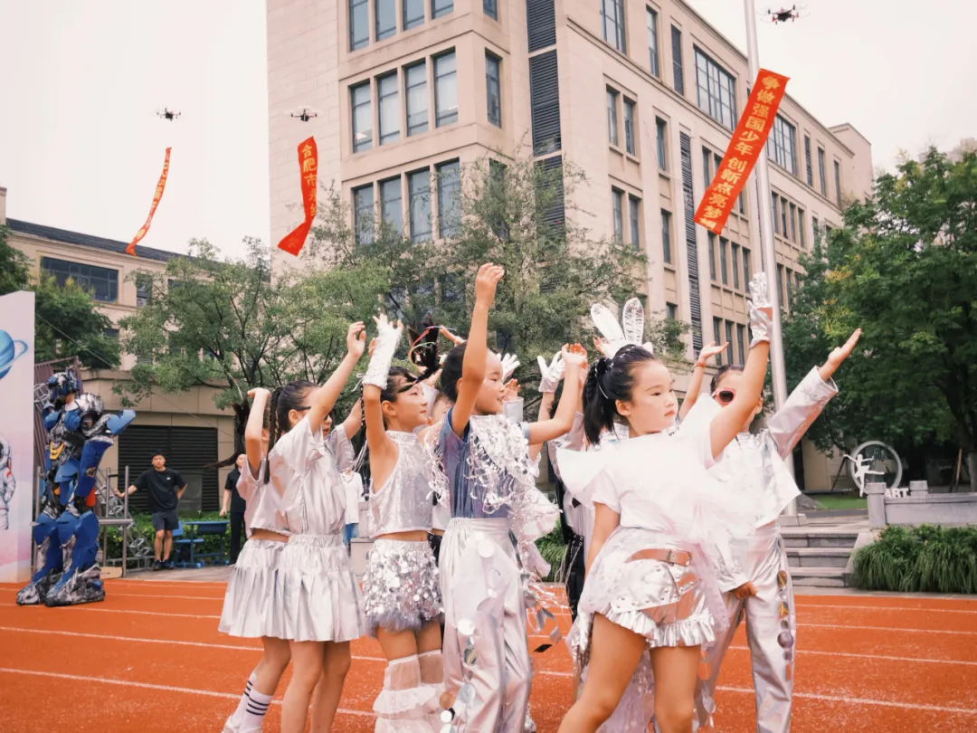 空天地協(xié)同展演——校無人機社團操控無人機凌空起舞,在操場上方變換出“火箭穿云”“星辰漩渦”等動態(tài)陣列;與此同時,二(1)班學生身著發(fā)光機甲套裝,在地面同步演繹原創(chuàng)科技舞臺秀。當無人機群化作“太空補給站”低空懸停時,小演員們通過編程指令觸發(fā)機甲燈光響應,天地光影實時交互,將硬核科技與藝術(shù)創(chuàng)想深度融合,為師生呈現(xiàn)了一場震撼的視聽盛宴。